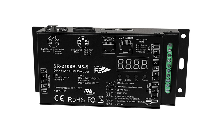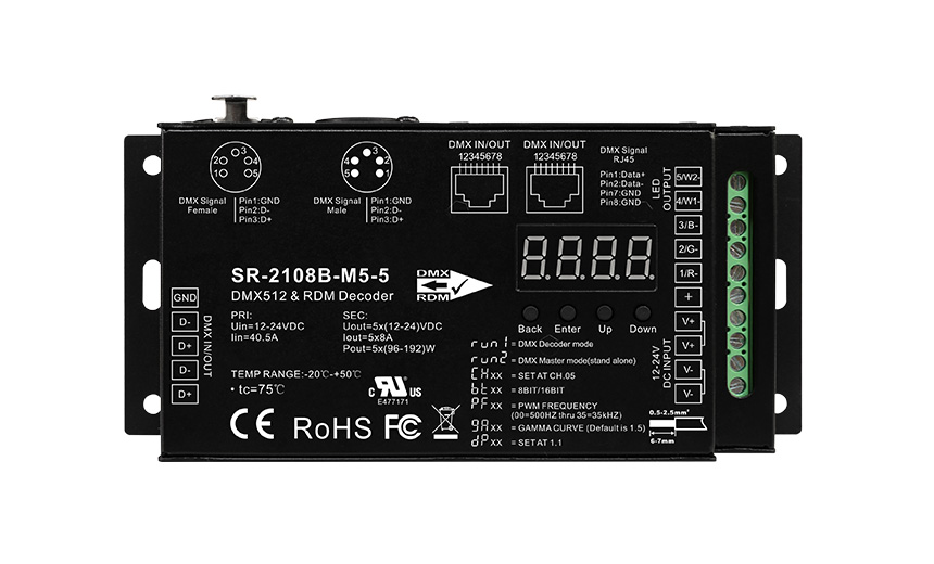 5個(gè)PWM輸出通道,共陽(yáng), DMX通道數(shù)1-5可設(shè)置