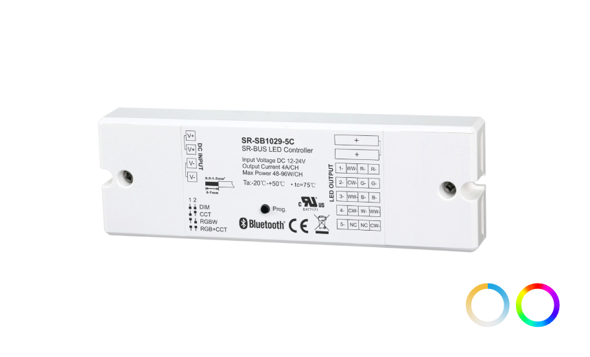 控制器可配置為六種不同的燈光類型:RGB+CCT、RGBW、RGB、CCT、DIM、ON/OFF